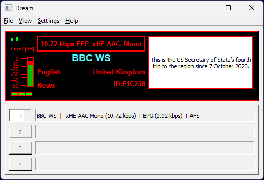 You can hear how clear the signal sounds. It is FM radio quality without any static. The occassional drop-outs were bursts of atmospheric noise. This appears as noise on the raw DRM broadcast signal. Because the broadcast is being decoded from digital to analog, the noise disrupts the decoding so the noise appears as a drop-out (silence) in the decoded audio. The recording was made directly from the Dream audio feed to the computer.